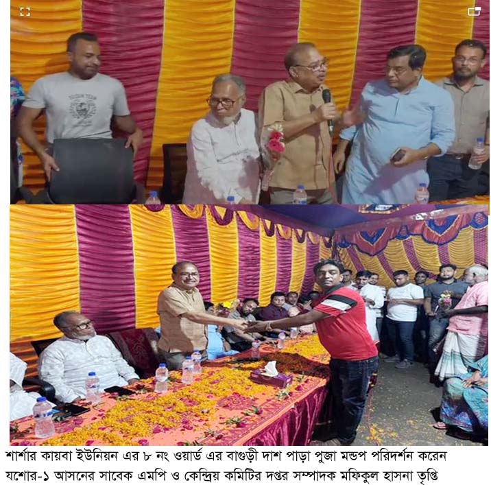 সাবেক এমপি মফিকুল হাসান তৃপ্তি শান্তিপুর্ণ ভাবে দুর্গাপূজা উদযাপন এর আহবান জানিয়ে বলেন আমাদের দ্বারা কখনো হিন্দু পরিবার ক্ষতিগ্রস্থ হয়নি। আমি যে কয়দিন এমপি ছিলাম সেই স্বল্প সময়ের মধ্যে এলাকার স্কুল কলেজ এমপিও ভুক্ত করা এবং হিন্দু সম্প্রদায়ের ছেলে মেয়েদের চাকুরী দেওয়ার ও উদ্যেগ নিয়েছিলাম। সে সময় আমার নির্বাচিত এলাকার রাস্তাঘাট সহ বিভিন্ন উন্নয়নমুলক কাজ করেছি। যদি আবার ক্ষমতায় আসতে পারি আমরা হিন্দু সম্প্রদায়ের পাশে থাকব এবং এলকার উন্নয়ন কাজ করব।
